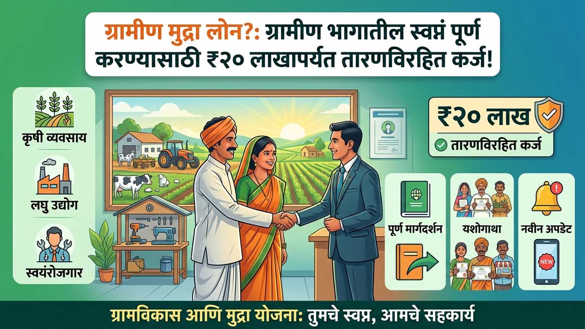 Gramin Mudra Loan?: ग्रामीण मुद्रा लोन म्हणजे प्रधानमंत्री मुद्रा योजना (PMMY) अंतर्गत ग्रामीण उद्योजकांसाठी उपलब्ध सोपा आणि तारणविरहित लोन. शिशु, किशोर, तरुण आणि नवीन तरुण प्लस कॅटेगरीत ₹५०,००० ते ₹२० लाख मिळवा. २०२६ च्या अपडेटसह अर्ज प्रक्रिया, पात्रता, कागदपत्रे, ब्याज दर आणि ग्रामीण यशोगाथा जाणून घ्या. ग्रामीण स्वयंरोजगार वाढवा!