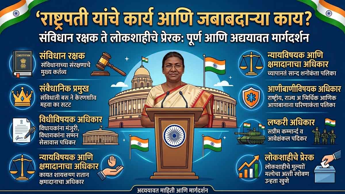 Rashtrapati Karya Ani Jababdarya Kay? : राष्ट्रपती म्हणजे कोण? भारताचे राष्ट्रपती हे देशाचे प्रथम नागरिक आणि संविधानाचे मुख्य रक्षक आहेत. त्यांच्या संविधानिक कार्य, जबाबदाऱ्या, विवेकाधिकार आणि २०२६ पर्यंतच्या नवीन न्यायिक अपडेट्सबद्दल सखोल माहिती. द्रौपदी मुर्मू यांच्या भूमिकेचा अनुभवावर आधारित विश्लेषण. लोकशाही कशी मजबूत होते ते जाणून घ्या!