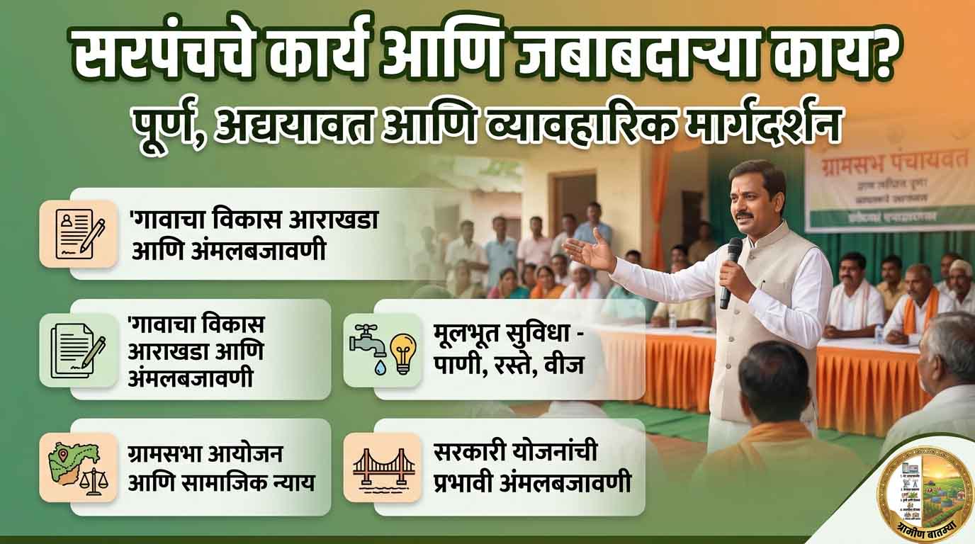 Sarpanch Karya Jababdarya Kay : महाराष्ट्रातील सरपंचांच्या कर्तव्ये, अधिकार, जबाबदाऱ्या, ७३व्या घटनादुरुस्तीचा प्रभाव आणि डिजिटल युगातील नवीन भूमिका यावर आधारित सखोल लेख. प्रत्यक्ष गावकऱ्यांच्या अनुभवातून समजून घ्या – गाव विकासासाठी सरपंच कसा बदल घडवू शकतो ते जाणून घ्या.