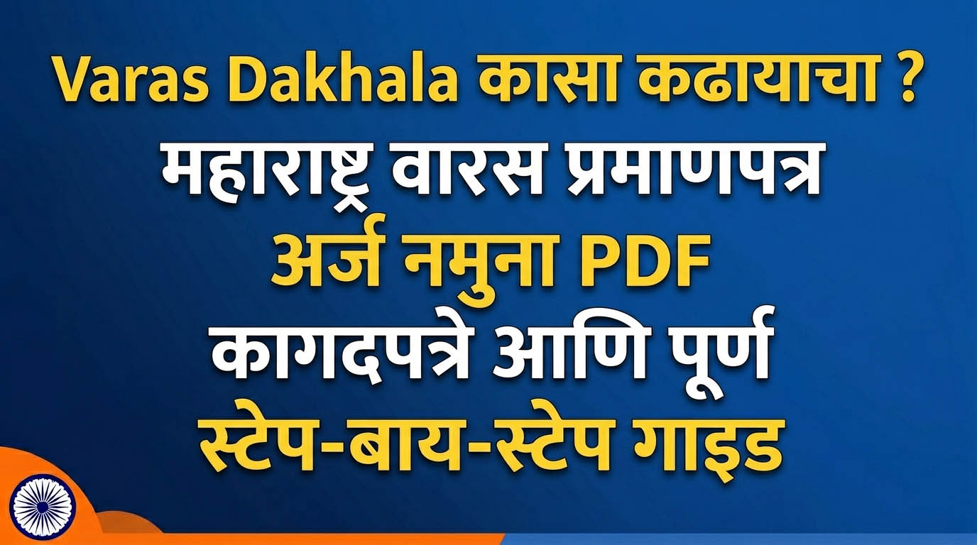 Varas Dakhala Kasa Kadhayacha?: महाराष्ट्रात वारस दाखला (वारस प्रमाणपत्र) काढण्याची सोपी प्रक्रिया, अर्ज नमुना PDF डाउनलोड, लागणारी कागदपत्रे, ऑनलाइन अर्ज, तहसीलदार कार्यालयातून कसा मिळवावा आणि Aaple Sarkar वर View Varas Certificate online कसे करावे. नवीन डिजिटल नियमांसह पूर्ण माहिती. घरबसल्या वारस दाखला काढा आणि मालमत्ता हक्क सुरक्षित करा!