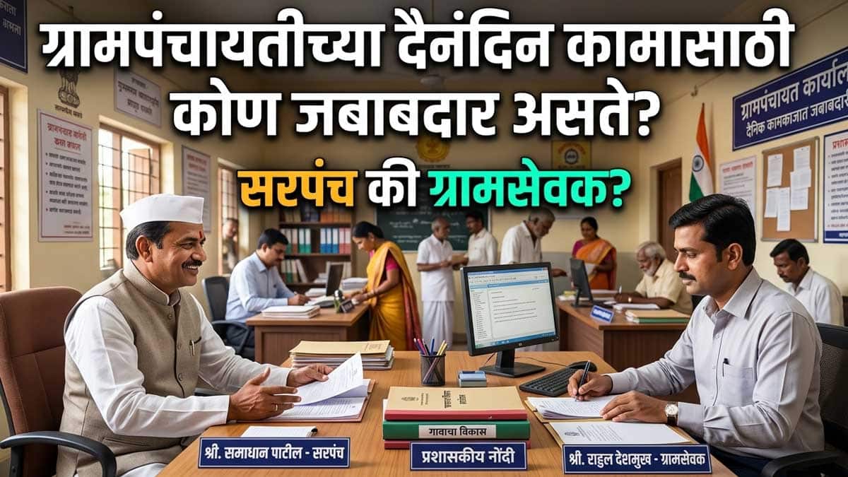 Who is responsible for the daily work of a Gram Panchayat? : ग्रामपंचायतीच्या दैनंदिन कामासाठी कोण जबाबदार असते? महाराष्ट्र ग्रामपंचायत अधिनियम १९५८ नुसार सरपंच, उपसरपंच आणि ग्रामसेवक यांच्या जबाबदाऱ्या जाणून घ्या. दैनंदिन कारभार, योजनांची अंमलबजावणी, प्रमाणपत्रे, करवसुली – सर्व काही सोप्या भाषेत. तुमच्या गावातील ग्रामपंचायत कशी चालते, नागरिक कसे जबाबदार धरू शकतात याची पूर्ण माहिती.